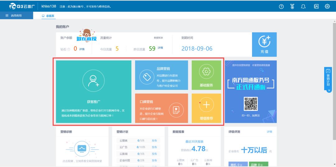 此外,为了更符合中小企业主的操作习惯,升级后的G3云推广还设置了悬浮式工具栏(营销计划),并在主版块界面下方增设了AI智能化的营销诊断、营销计划、数据报表和评级评测操作功能,为企业带来更加人性化的智能便捷操作体验和营销服务,系统数据交叉分析能力显著提高,企业依托全新升级的G3云推广平台将获得更加直观的营销效果与数据参考依据。
